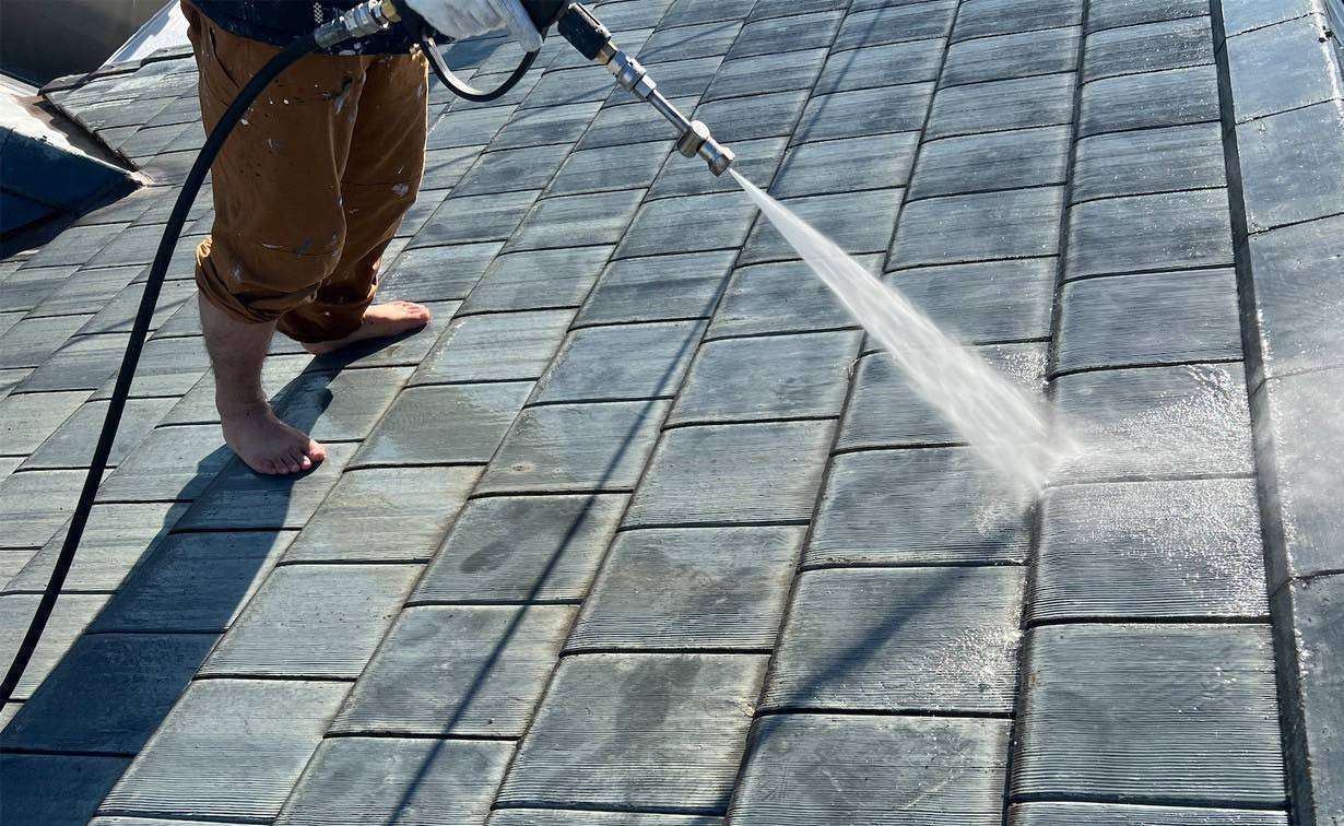 高圧洗浄: 長年蓄積した汚れ、古い塗膜、コケを徹底的に洗い流します。ここを疎かにすると、どんなに良い塗料を塗ってもすぐに剥がれてしまうため、最も重要な工程の一つです。