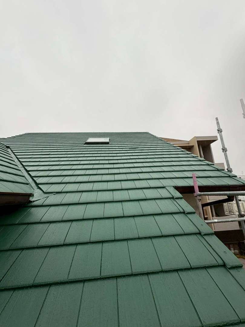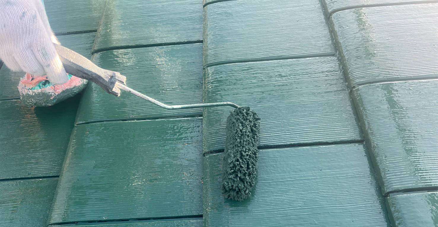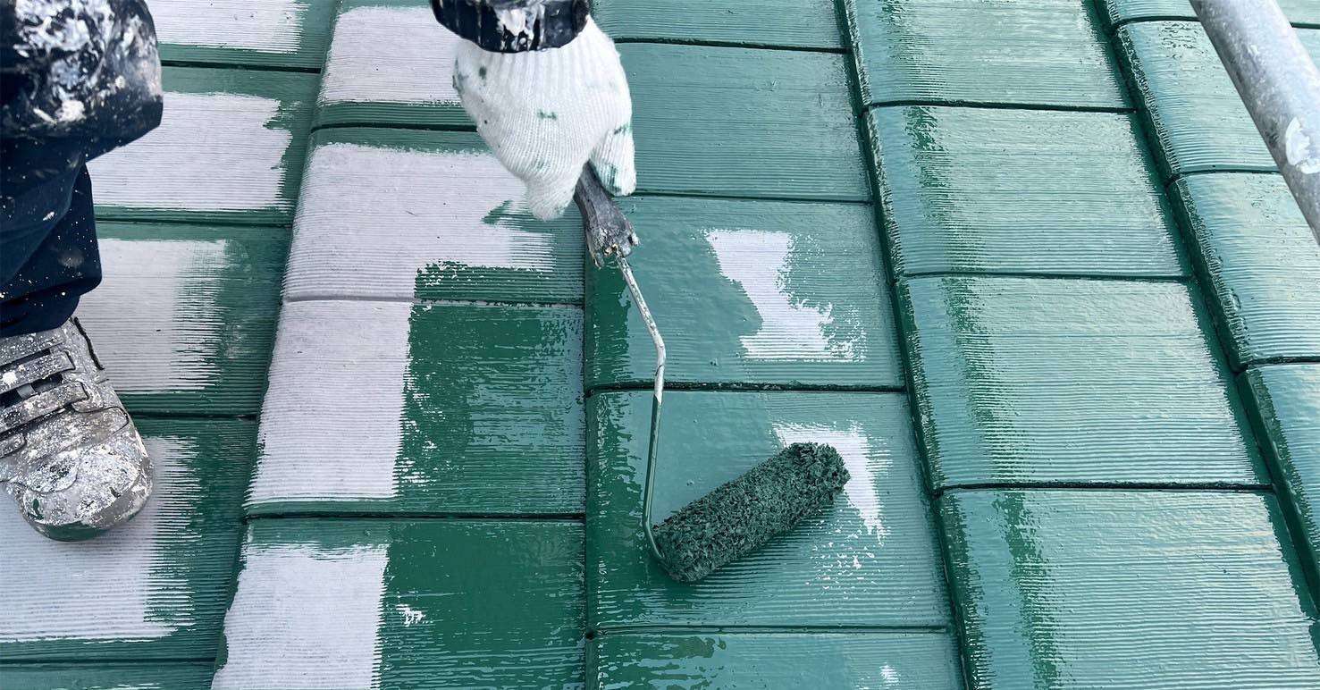 上塗り: 今回は落ち着きのある、鮮やかなグリーンの遮熱・耐候性塗料を採用。2回塗り重ねることで、厚い塗膜を形成し、ツヤと保護性能を最大限に引き出しました。